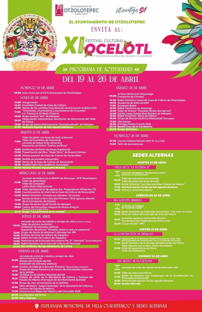 Otzolotepec, Estado de México.– Con una invitación abierta a la ciudadanía, la presidenta municipal de Sinaí Lugo anunció que todo está listo para la inauguración del XI Festival Cultural Ocelotl, en el marco de la quinta edición de la Feria del Helado y el Chumiate, uno de los eventos más representativos del municipio.