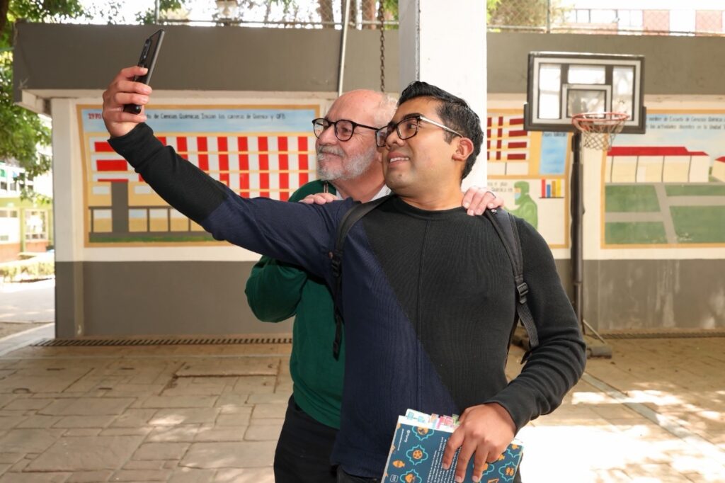 Como parte de su visita, el escritor participó junto a estudiantes en la realización del experimento conocido como “pasta de dientes para elefantes”, una actividad lúdica que permitió mostrar los conocimientos desarrollados en la Facultad de Química.