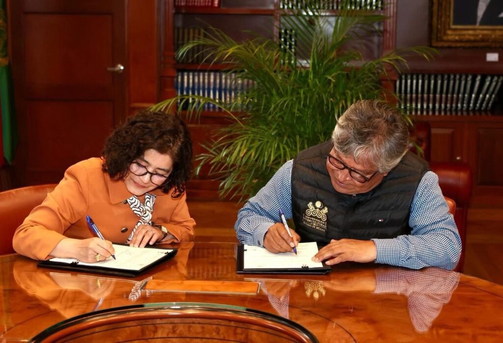 Toluca, Estado de México.— La rectora de la Universidad Autónoma del Estado de México (UAEMéx), Patricia Zarza, encabezó la firma de un convenio de colaboración con la Universidad Intercultural del Estado de México (UIEM), dirigida por el maestro Antolín Celote Preciado, con el objetivo de fortalecer la cooperación institucional y ampliar las oportunidades académicas para la comunidad estudiantil.