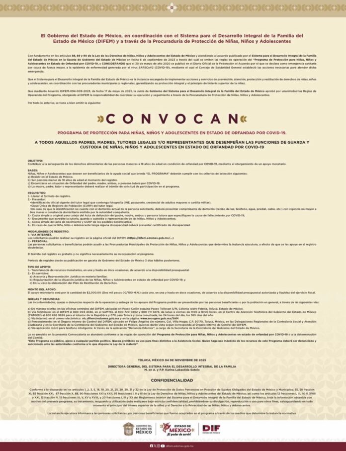 Con esta convocatoria, el Gobierno del Estado de México reitera su compromiso de proteger a la infancia y adolescencia mexiquense, brindando apoyo a quienes enfrentan las consecuencias sociales de la pandemia con solidaridad, empatía y responsabilidad institucional.