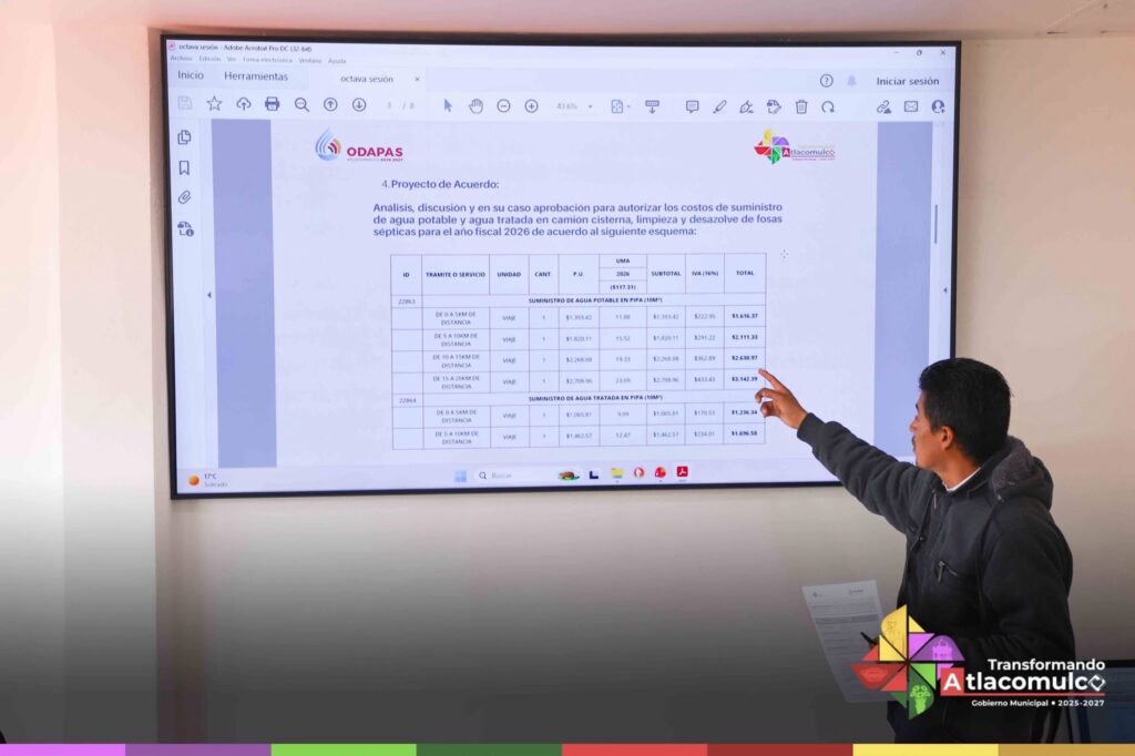 Durante la sesión, se avaló la actualización de los costos para el suministro de agua potable y agua tratada mediante camión cisterna, así como de los servicios de limpieza y desazolve de fosas sépticas correspondientes al ejercicio 2026.