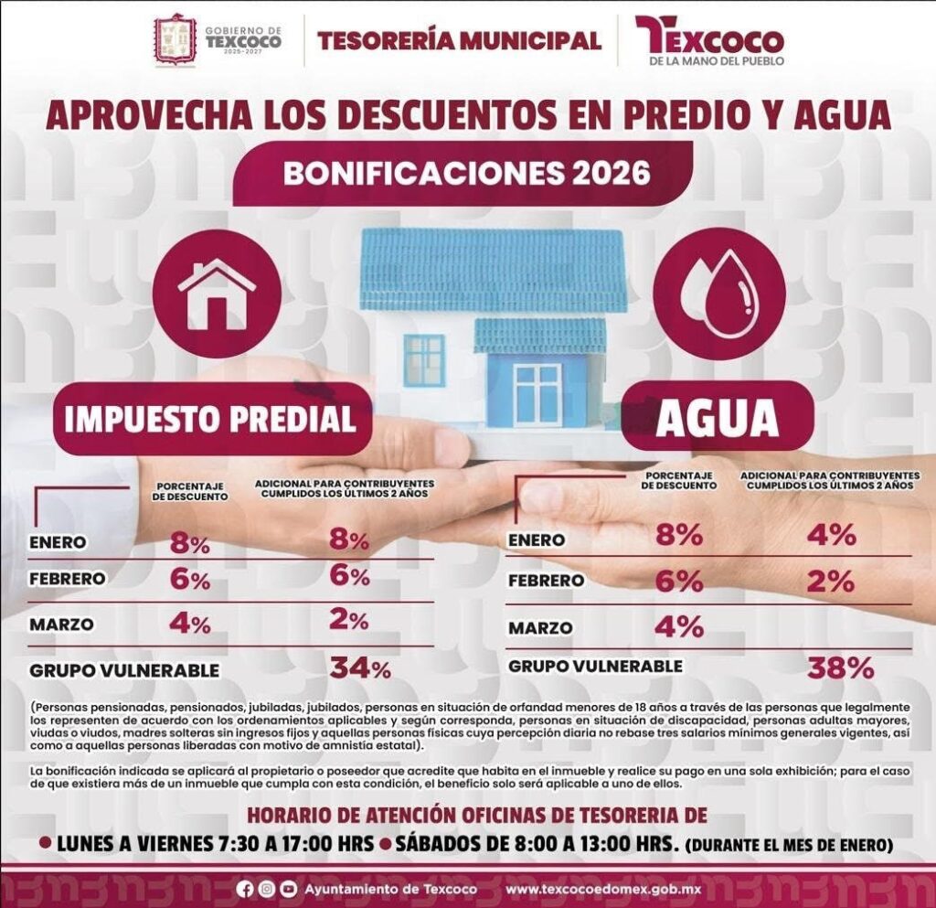 Texcoco, Estado de México.– Con el objetivo de apoyar la economía de las familias y fomentar el cumplimiento oportuno de las contribuciones municipales, el Ayuntamiento de Texcoco, a través de la Tesorería Municipal, puso en marcha el programa de descuentos y bonificaciones 2026 en el pago del impuesto predial y el derecho de agua potable.