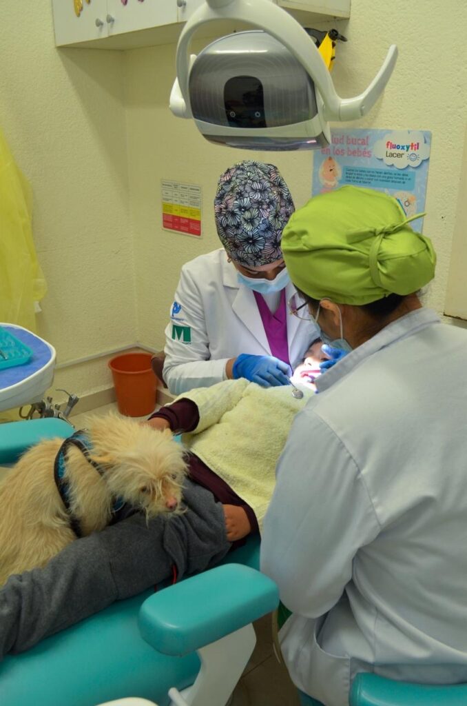 Este innovador programa cuenta con la participación de cinco lomitos entrenados para brindar apoyo emocional a las y los pequeños pacientes. Actualmente, el esquema de trabajo se desarrolla con dos grupos de seres sintientes: el primero recibe a niñas y niños en el exterior del hospital para ayudarlos a relajarse antes de su consulta, mientras que el segundo los acompaña dentro del consultorio durante los procedimientos dentales. En promedio, los perritos acompañan a por lo menos seis pacientes por cada visita.