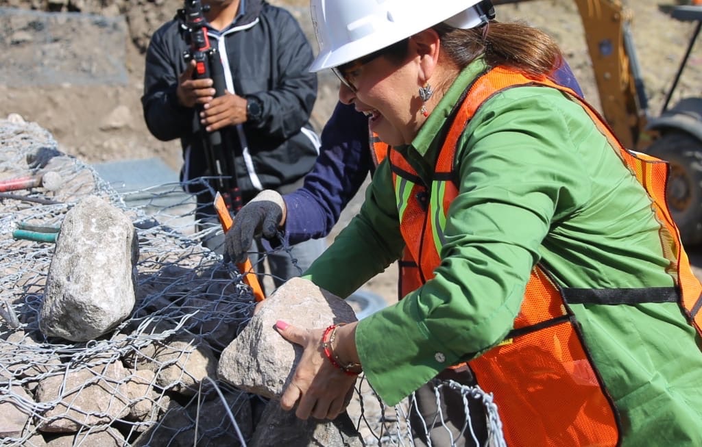 La presidenta municipal, Azucena Cisneros Coss, supervisó los trabajos en la zona ubicada en la Sierra de Guadalupe, donde personal operativo edifica la estructura que permitirá frenar las llamadas “aguas broncas” y retener los sólidos que descienden a gran velocidad por cauces naturales y barrancas.