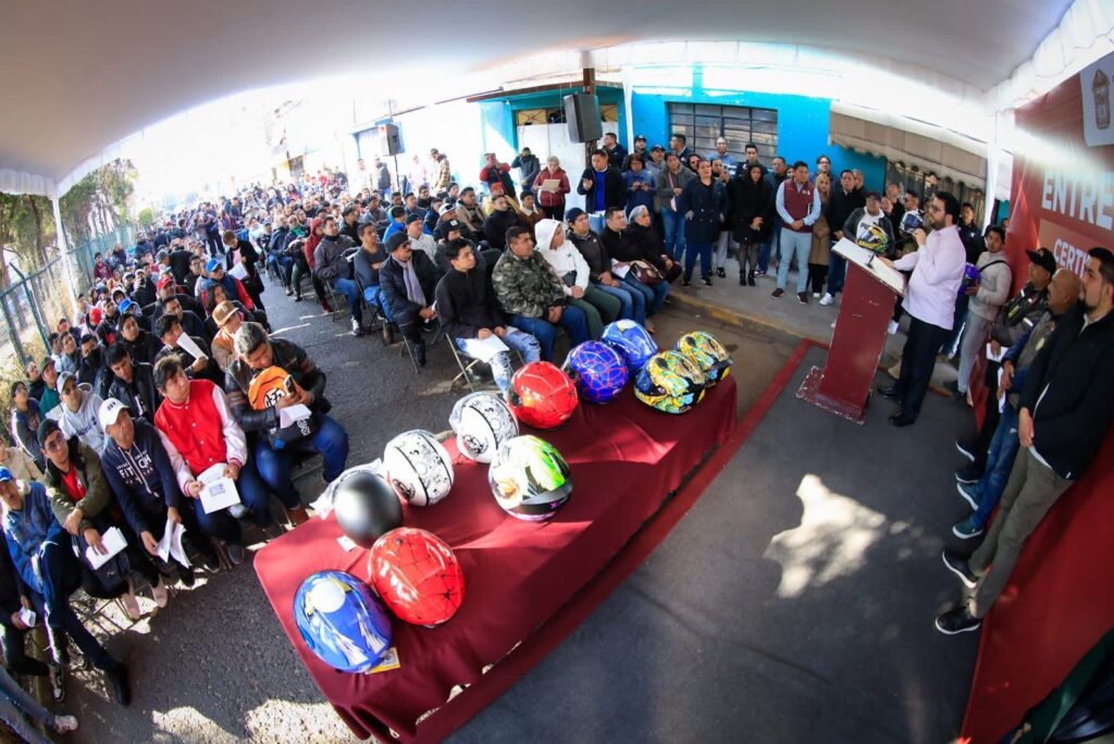 Como parte de las actividades posteriores a la Mesa de Paz, el alcalde Isaac Montoya entregó 150 cascos certificados a motociclistas de distintas comunidades del municipio, con el propósito de preservar la integridad física de quienes circulan diariamente por las calles y avenidas de Naucalpan, además de fomentar una cultura de prevención y responsabilidad vial.