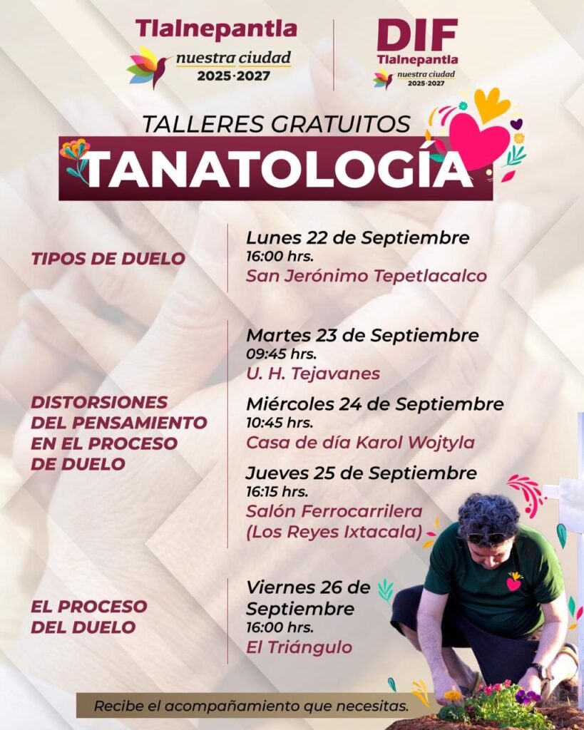 Con el propósito de brindar orientación y acompañamiento a las personas que enfrentan la pérdida de un ser querido, el Sistema Municipal DIF Tlalnepantla anunció la realización de talleres gratuitos de tanatología, que se llevarán a cabo del 22 al 26 de septiembre en diversas comunidades del municipio.