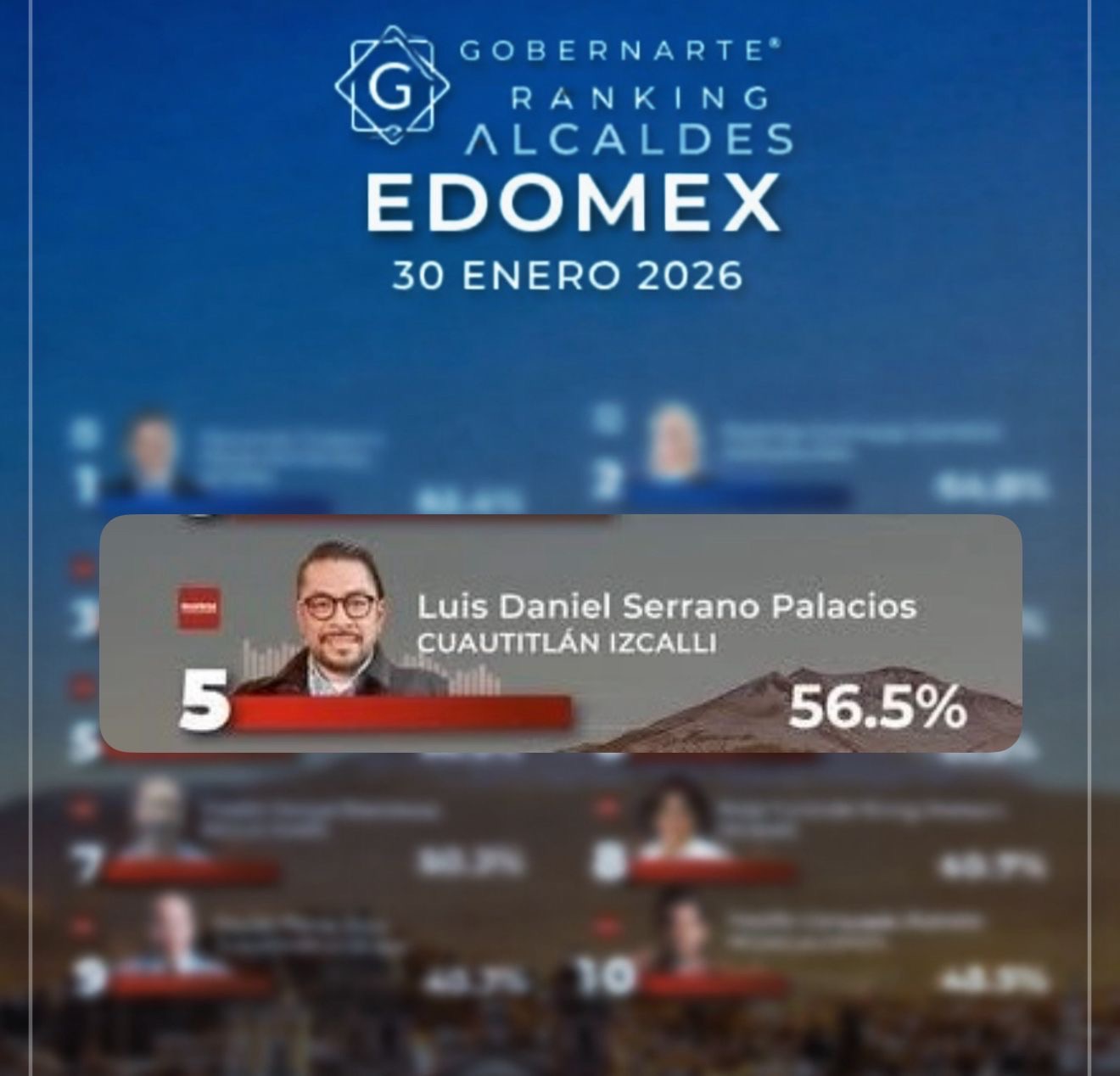 De acuerdo con la medición correspondiente a enero realizada por la encuestadora Gobernarte, Daniel Serrano se colocó dentro del top cinco de alcaldes mexiquenses, al alcanzar un 56.5% de aprobación ciudadana. En tanto, la firma Metametrics lo posicionó en el segundo lugar de su ranking estatal, con una aprobación del 61.3% durante el mismo periodo.