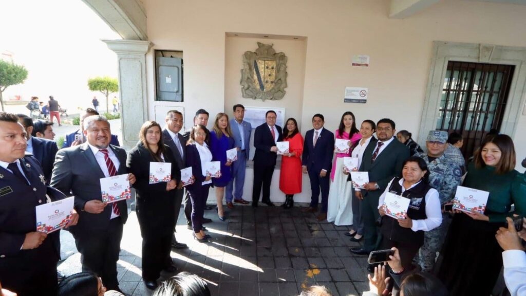 Como parte del acto protocolario, autoridades auxiliares de las distintas regiones del municipio recibieron de manera simbólica un ejemplar del nuevo Bando Municipal, con la encomienda de difundir su contenido entre las y los vecinos de sus comunidades.
