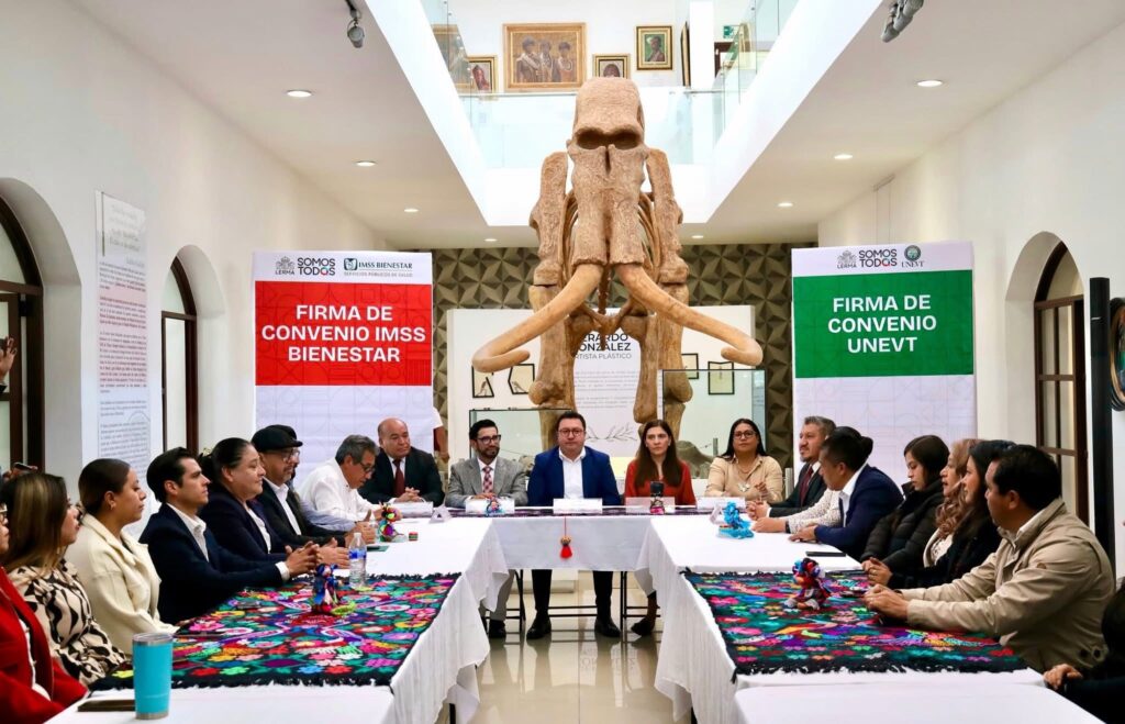 Lerma, Estado de México.– Con el objetivo de fortalecer la atención en salud pública y ampliar las oportunidades para la comunidad universitaria, el presidente municipal de Miguel Ángel Ramírez Ponce encabezó la firma de convenios de colaboración con el IMSS Bienestar y la Universidad Estatal del Valle de Toluca.