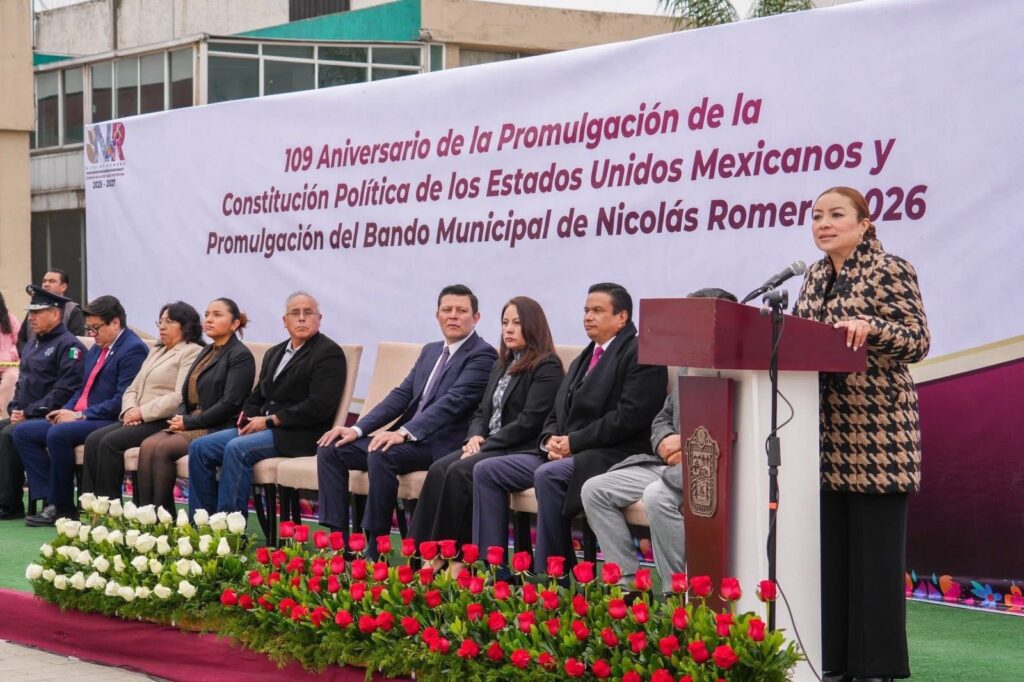Nicolás Romero, Estado de México.— Con un acto solemne y de profundo significado cívico, el Gobierno Municipal de Nicolás Romero conmemoró el 109 Aniversario de la Promulgación de la Constitución Política de los Estados Unidos Mexicanos, así como la Promulgación del Bando Municipal 2026, documento rector de la vida pública y la sana convivencia social en el municipio.