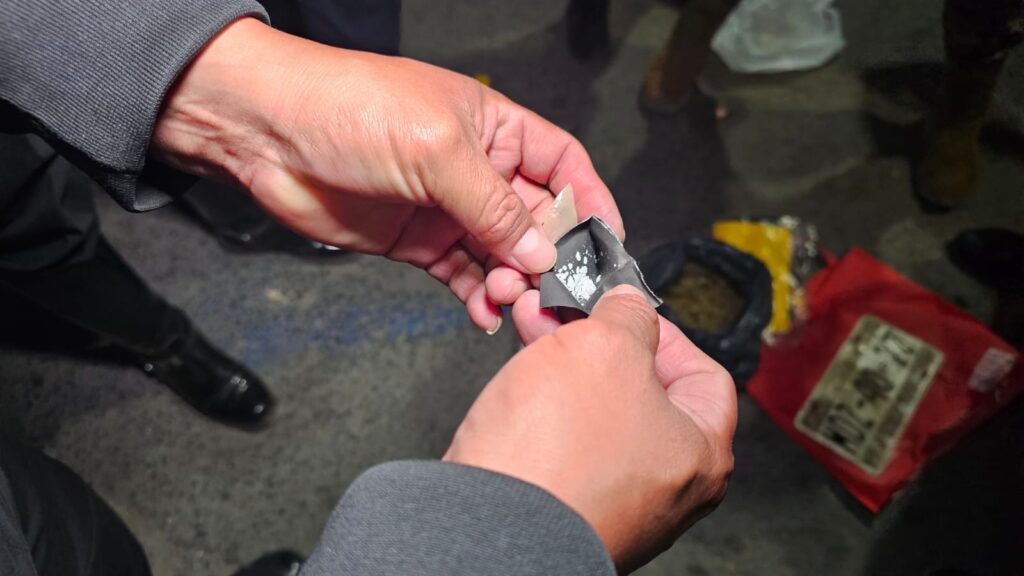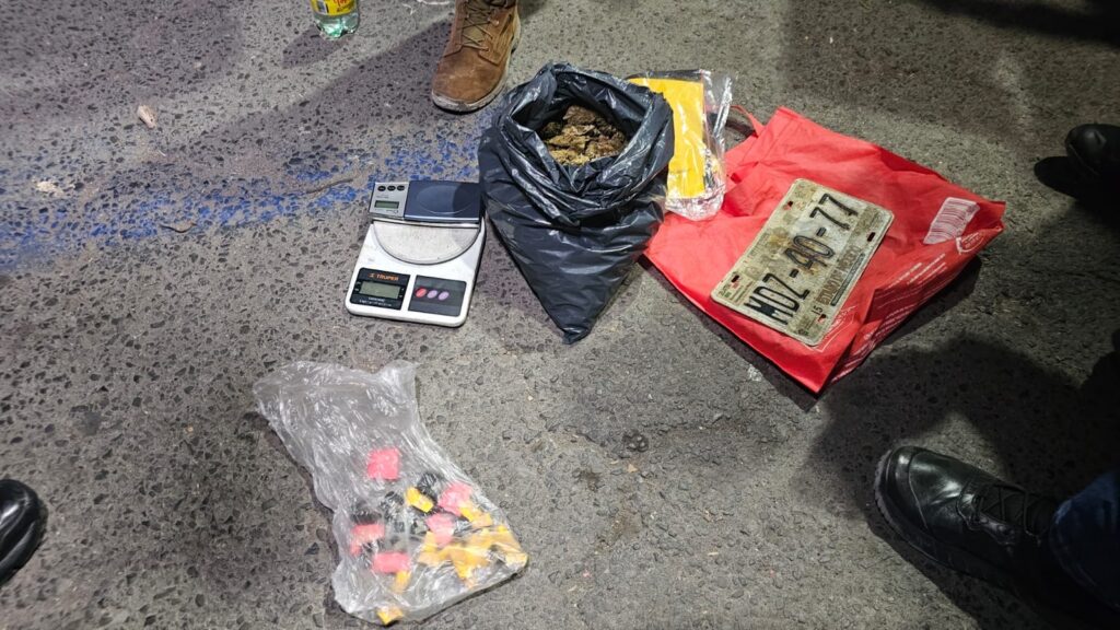 Durante el retén, los policías también detectaron a un motociclista que intentó huir y arrojó una bolsa de plástico en la vía pública. Tras recuperarla, los oficiales hallaron 19 envoltorios de piedra sólida, un kilo de hierba verde con características de marihuana, 10 envoltorios de polvo blanco con características de cocaína, además de una báscula gramera. Todo el material fue puesto a disposición del Ministerio Público para iniciar las investigaciones correspondientes.