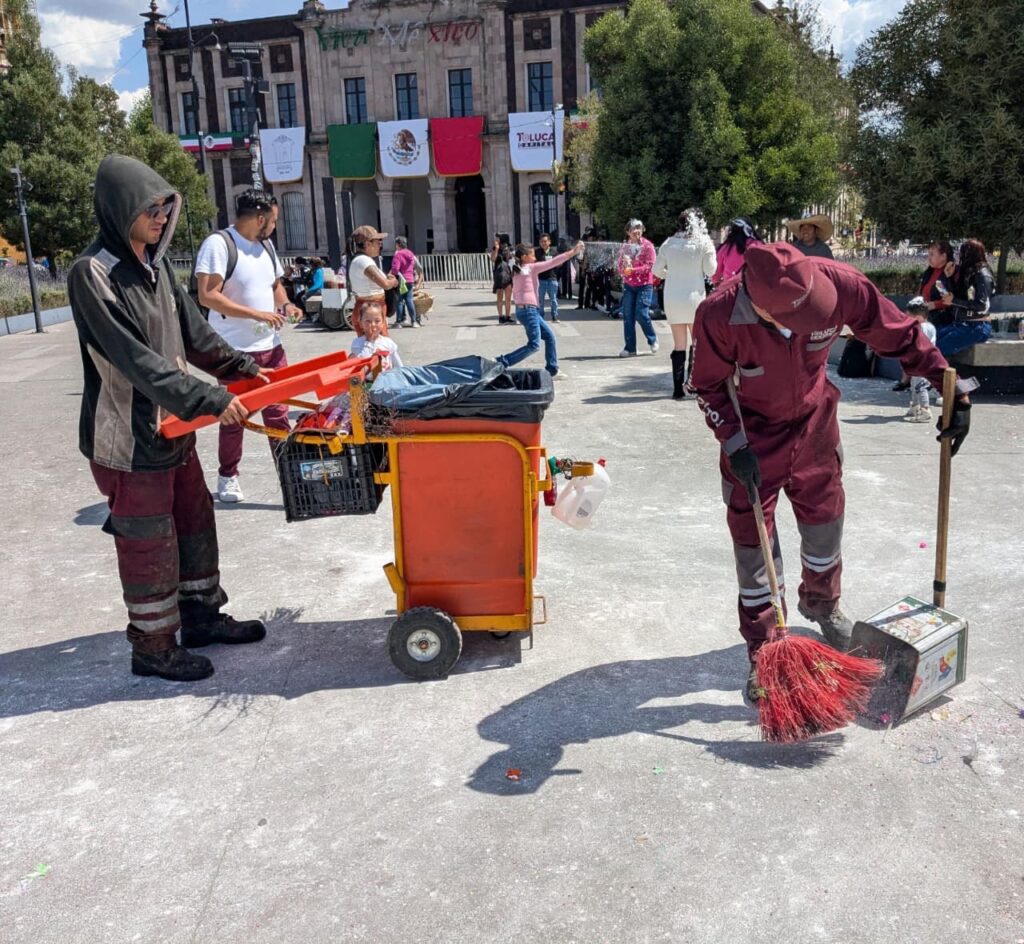 Toluca, Estado de México, 17 de septiembre de 2025.- Tras los festejos por el 215 Aniversario del Inicio de la Independencia de México, trabajadores de Servicios Públicos del Ayuntamiento de Toluca retiraron 13 toneladas de basura de calles y avenidas de la capital mexiquense.