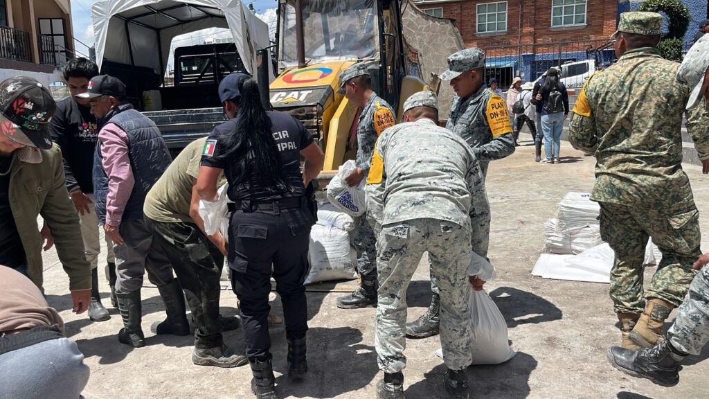 Los trabajos de encostalamiento continúan en San Pedro Tultepec, como parte de la aplicación del Plan DN-III-E, con el objetivo de mitigar los efectos de las lluvias atípicas que han afectado a esta delegación.