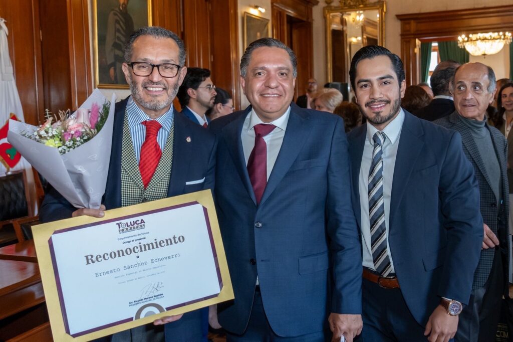 Durante la ceremonia, el edil entregó reconocimientos por su trayectoria y aportaciones a Joaquín Alava Quintanilla, Jesús Henkel Libién, Carlos Alejandro Monroy Carrillo, Guillermo Ochoa García y Guillermo Jorge Ríos Abarca, mejor conocido como Memo Ríos, quienes con su talento y compromiso han enaltecido el nombre de Toluca.
