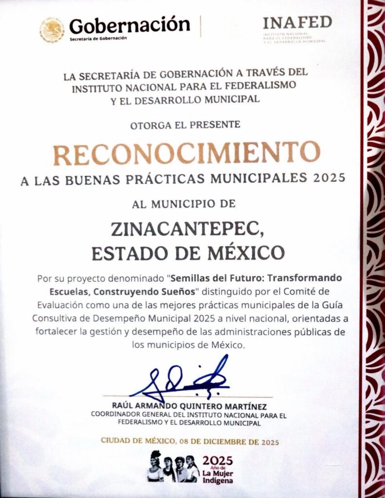 Zinacantepec, Estado de México.— El municipio de Zinacantepec fue reconocido a nivel nacional como uno de los ocho gobiernos locales con “Buenas Prácticas Municipales”, distinción otorgada por el Instituto Nacional para el Federalismo y el Desarrollo Municipal en coordinación con la Secretaría de Gobernación.