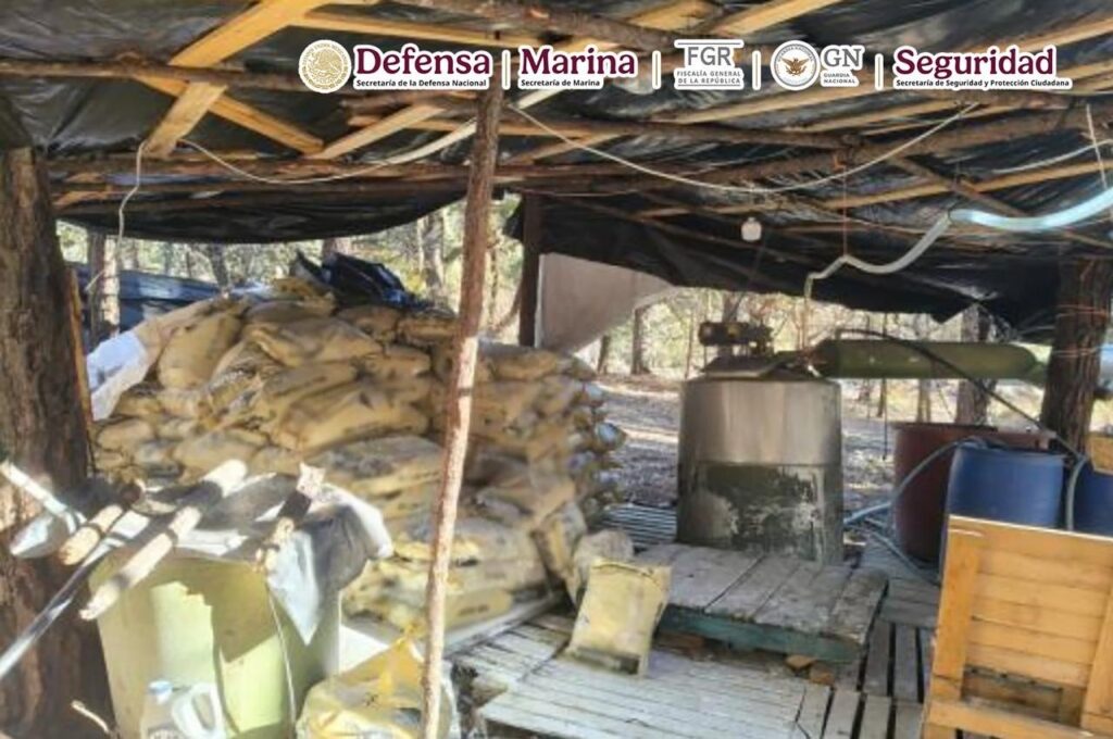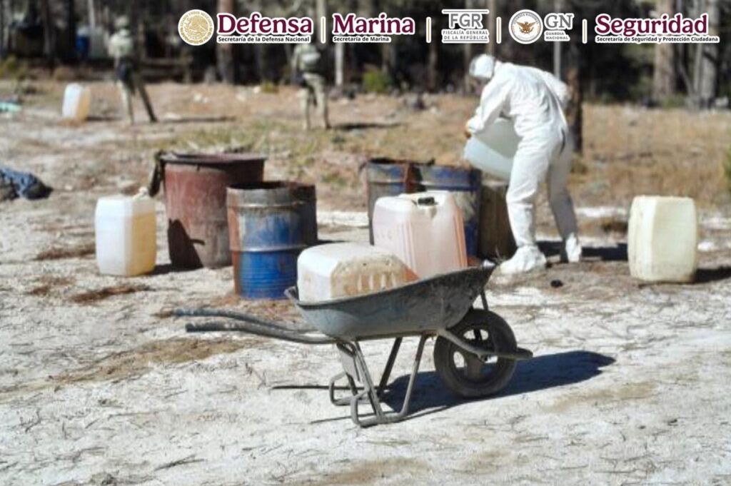 En una acción paralela, en el estado de Durango, personal de las fuerzas federales localizó e inhabilitó un laboratorio clandestino utilizado para la elaboración de drogas sintéticas, ubicado a aproximadamente 10 kilómetros del municipio de Tepehuanes. En el sitio fueron asegurados cuatro reactores, 12 destiladores, ollas, bidones, 250 bultos de sosa cáustica, galones con tolueno, diversas sustancias químicas, así como utensilios de trabajo y maquinaria especializada.