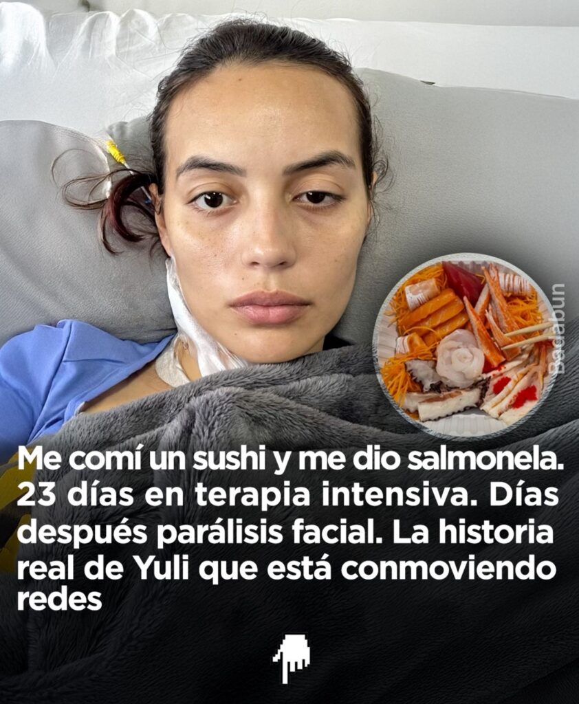 De acuerdo con su testimonio, todo inició después de ingerir un plato de sushi que desencadenó una infección por salmonela, bacteria que suele transmitirse a través de alimentos contaminados. La gravedad del cuadro la llevó a permanecer 23 días en terapia intensiva, enfrentando complicaciones que pusieron en riesgo su vida.