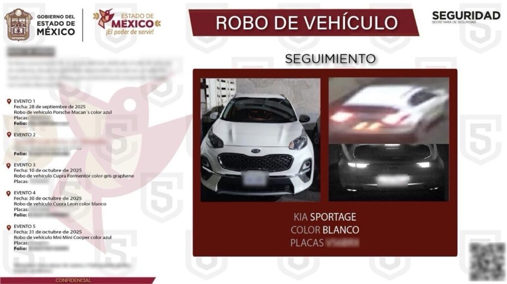 La investigación se originó el pasado 31 de octubre, cuando personal del C5 tuvo conocimiento del despojo de un automóvil Mini Cooper color azul en la colonia Valle Verde, municipio de Tlalnepantla. La víctima señaló que varios sujetos participaron en el ilícito y huyeron a bordo de una camioneta Kia Sportage blanca.