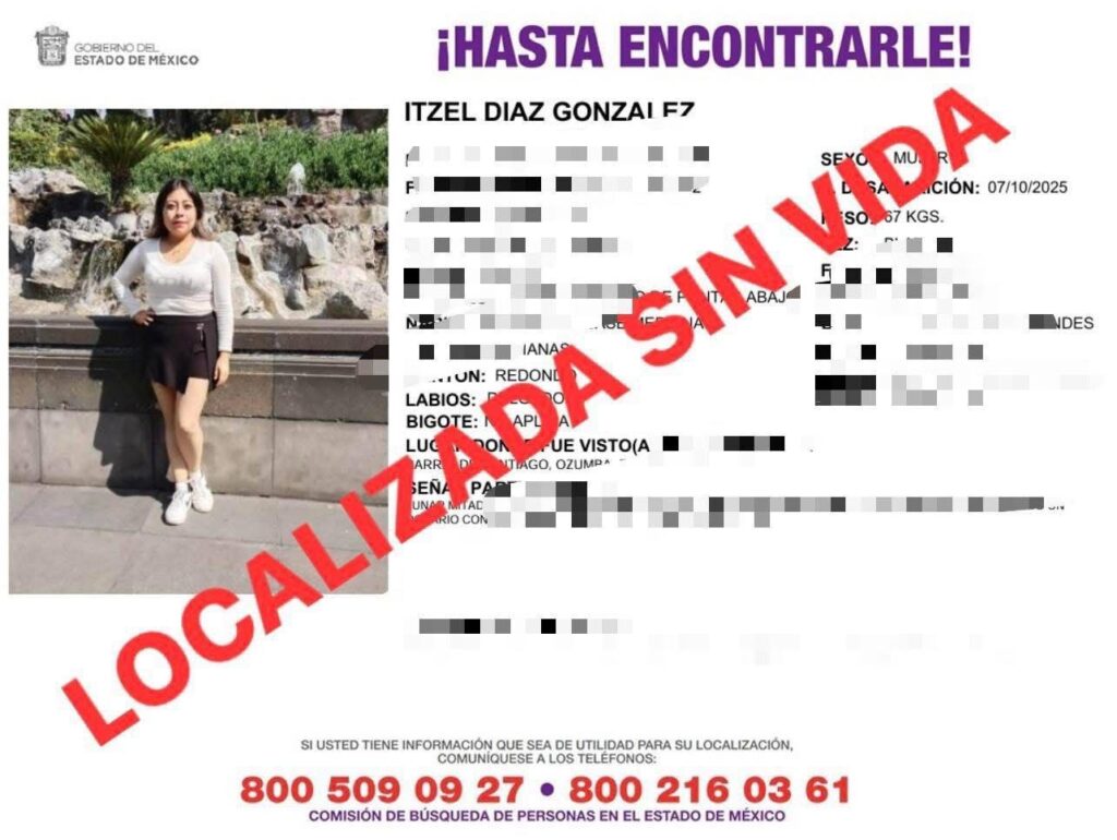 La geolocalización de su dispositivo apuntaba, incluso, a Zacatecas, por lo que se activó una alerta nacional. En paralelo, los familiares se presentaron en el domicilio del joven con quien Itzel había salido, ubicado en Tepetlixpa. Él negó tener conocimiento de ella o haberla visto. Aun así, la búsqueda continuó incansable.