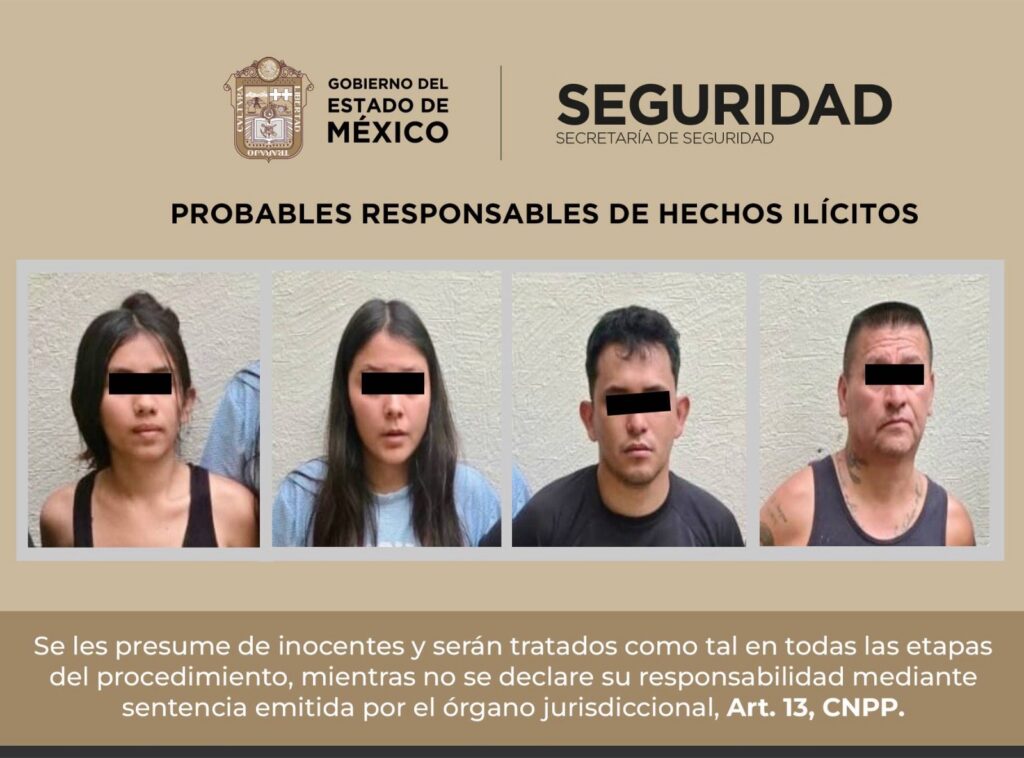 Como resultado, fueron detenidos José “N” de 54 años, Axel “N” de 25 años, Fernanda “N” de 20 años y Suri “N” de 24 años, quienes junto con el vehículo y los objetos asegurados quedaron a disposición de la Agencia del Ministerio Público en Chalco, donde se definirá su situación jurídica.