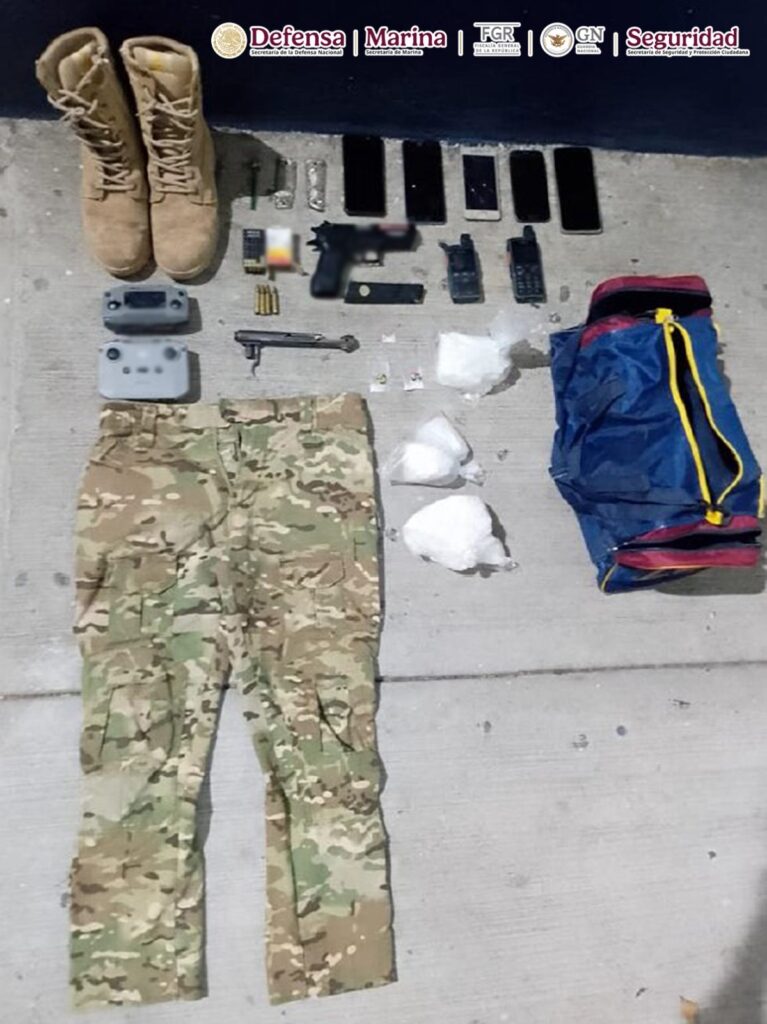 Tras implementar dispositivos de seguridad y realizar recorridos de vigilancia, los agentes ubicaron a los tres sujetos y les marcaron el alto para efectuar una inspección preventiva. Durante la revisión se aseguraron cinco teléfonos celulares, dos controles para dron, dos radios de comunicación, 14 cartuchos útiles, piezas de armas de fuego, una réplica de arma de fuego, un arma de fabricación artesanal y tres bolsas con presunta droga.