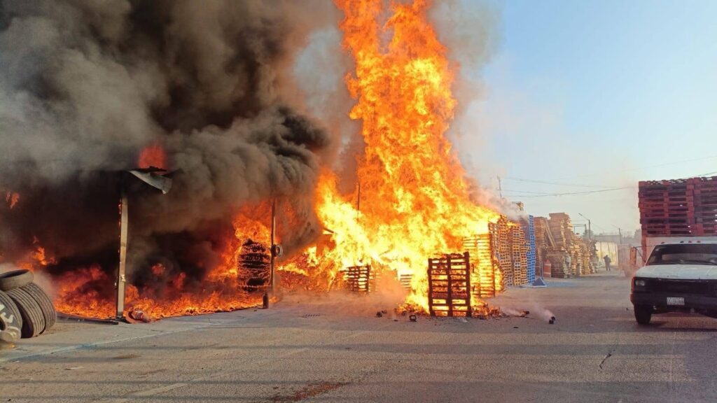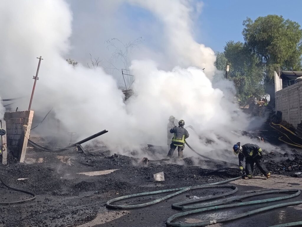 Teoloyucan, Méx., Elementos del cuerpo de bomberos de Gobierno de Teoloyucan 2025-2027 atendieron un llamado de apoyo para combatir un incendio registrado en el municipio vecino de Cuautitlán Izcalli, donde se quemaron tarimas.