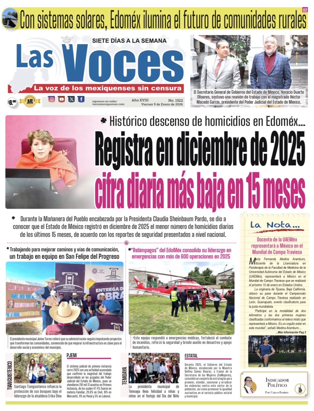 conocer que el Estado de México registró en diciembre de 2025 el menor número de homicidios diarios de los últimos 15 meses, de acuerdo con los reportes de seguridad presentados a nivel nacional