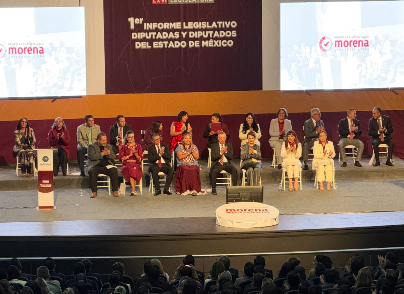 La gobernadora Delfina Gómez Álvarez atestiguó el Primer Informe Legislativo de diputadas y diputados federales mexiquenses de Morena, realizado en el Teatro Morelos de Toluca.