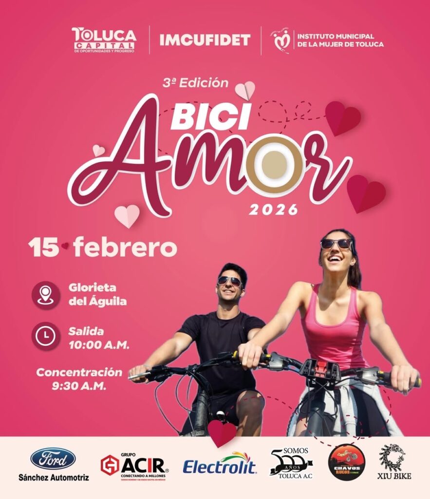 Toluca, Estado de México, 8 de febrero de 2026.– El Gobierno municipal de Toluca convocó a ciclistas, clubes deportivos y público en general a participar en la rodada recreativa “Bici Amor”, un evento temático por el Día de San Valentín que recorrerá 12 kilómetros por las principales calles del centro histórico de la capital mexiquense.