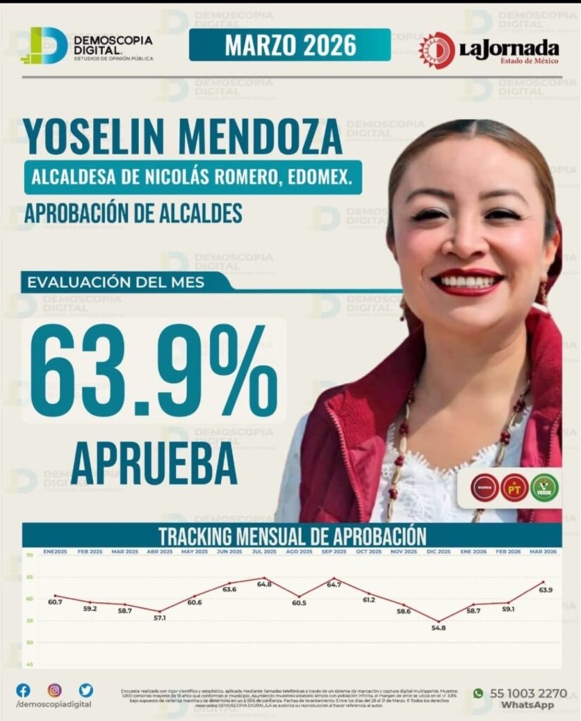 Con estos indicadores, Yoselin Mendoza se consolida como una de las presidentas municipales con mayor reconocimiento tanto en el Estado de México como a nivel nacional, al mantener una evaluación positiva por parte de la ciudadanía.